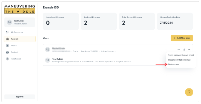 - Please reach out to our team at schools@maneuveringthemiddle.com with the teacher’s name and email address. We will add the teacher back to your account.